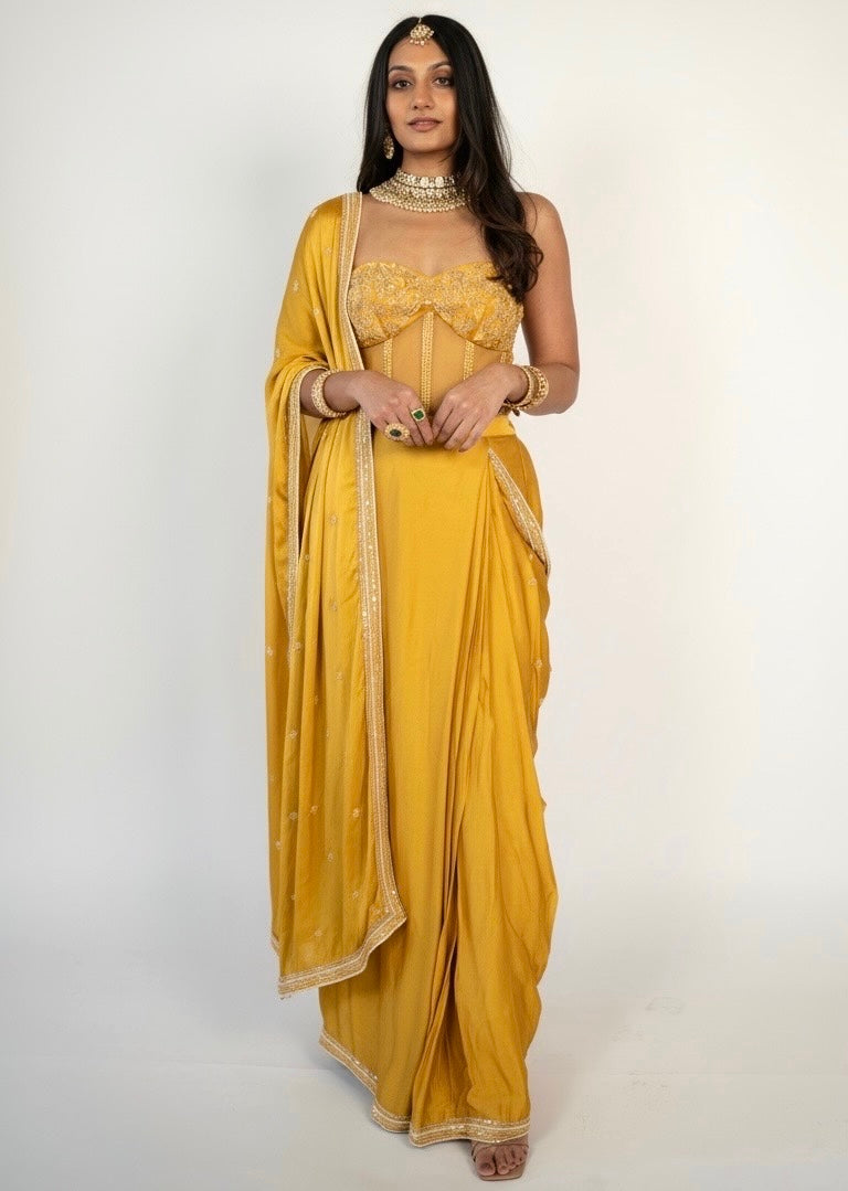 A statement satin pre-draped sari paired with a structured corset blouse crafted in satin and net. This ensemble features intricate zardozi embroidery highlighted with self resham, kora, and saadi work in rich shades of gold and antique tones.